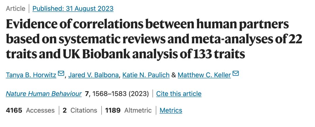 [1] Horwitz T B, Balbona J V, Paulich K N, et al. Evidence of correlations between human partners based on systematic reviews and meta-analyses of 22 traits and UK Biobank analysis of 133 traits[J]. Nature Human Behaviour, 2023: 1-16.